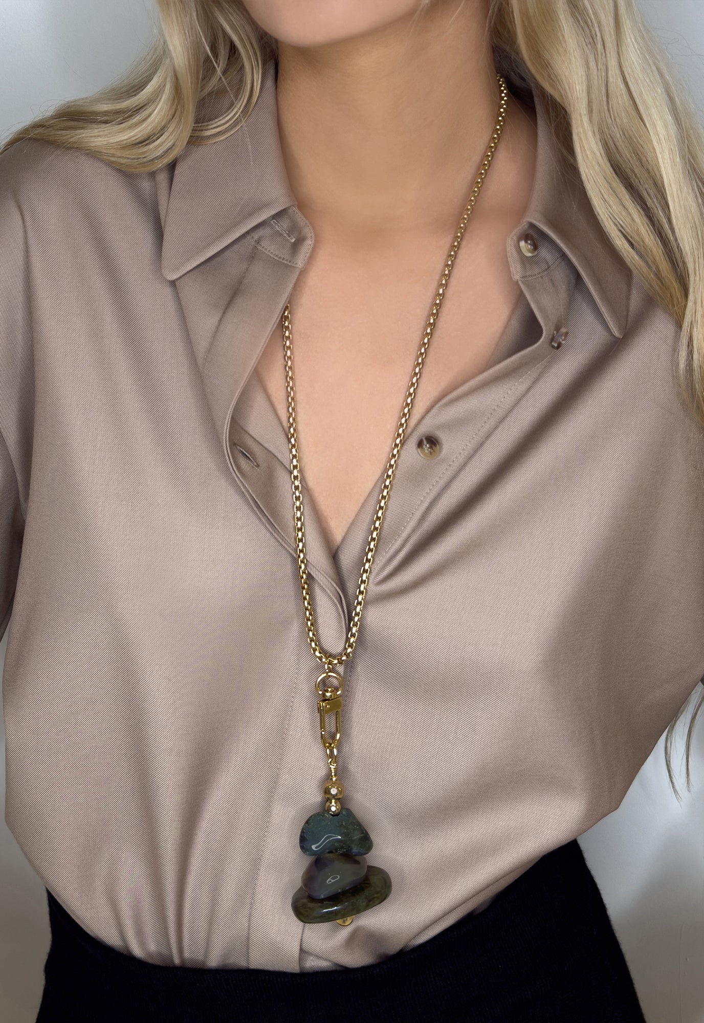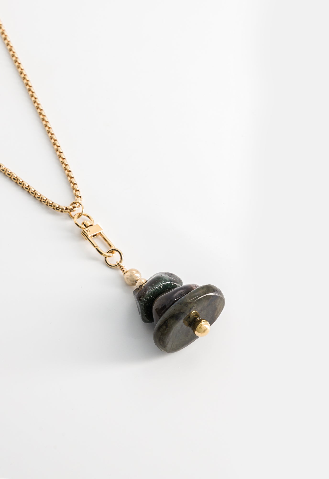 Pendant composed of three stacked stones (from top to bottom): Fuchsite, Botswana gray agate, and labradorite. Box chain with signature clasp, worn at the front. This piece is unique and entirely handcrafted in a Parisian workshop. Each tumbled stone is carefully selected and individually assembled, giving each necklace an exclusive and distinctive character.